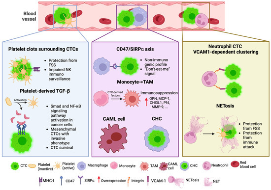 Here, we will focus on the interactions between CTCs and platelets, macrophages and neutrophils, and on the immune-related consequences of these interplays (Figure 2).