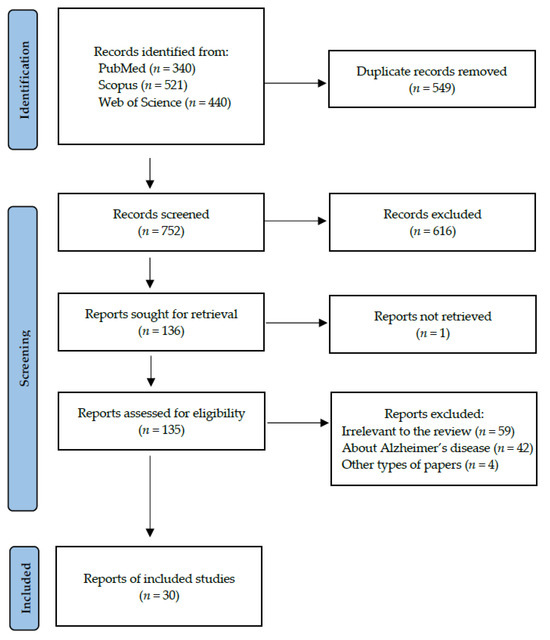 Following the search criteria presented in the section “Materials and Methods”, our systematic review included thirty studies, demonstrating data collected in fourteen different countries from a total of 2032 participants with diagnosed Parkinson’s Disease. Figure 2 reports the detailed record search strategy.