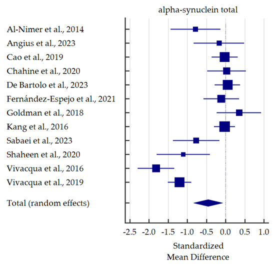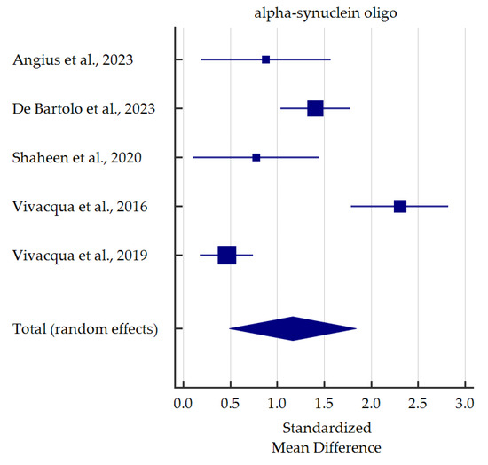 Alpha-synuclein (α-syn) is a neuronal protein concentrated in the presynaptic nerve terminals [65]. Under physiological conditions, it plays an essential role in regulating synaptic plasticity and function [66]. However, in PD pathophysiology, α-syn aggregates and forms various structures, including monomers, oligomers, and fibrils, which present different neurotoxic characteristics [67]. Indeed, evidence indicates that α-syn is not only a pathological hallmark of PD, but it might also trigger neuronal dysfunction or death [68]. α-syn toxicity may occur via several pathways, including mitochondrial or synaptic impairment, proteostasis loss, endoplasmatic reticulum stress, neuroinflammation, and aberrant cell apoptosis [69]. Interestingly, apart from the already mentioned oligomerized form of α-syn (o-α-syn), another common modification is phosphorylation at serine-129 (p-α-syn), which alters its solubility and promotes aggregation [70,71]. With the addition of total α-syn (t-α-syn), these three α-syn types have been extensively studied [72], as in studies included in this meta-analysis.