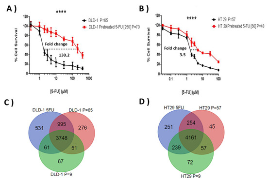 Comparative 5-FU sensitivity of the generated resistant sublines and their respective wild types (A,B), and the similarities and differences seen in terms of protein expression for the different sublines (C,D). Graphs (A,B) show cell survival profiles of parent cell lines and their respective resistant sublines to 5-FU for (A) DLD-1 (B) HT-29 CRC cell lines under exposure to (A) 5-FU [1–1000 µM] and (B) 5-FU [0.03–100 µM] doses over 96 h. MTT assays were performed in three independent experiments. The difference in IC50 among parental cell line and resistant 5-FU sublines is highly significant in the three experiments (p ≤ 0.0001). A 130.2-fold change and 3.5-fold change difference in IC50 was found in the DLD-1/5-FU [250 µM] and HT-29/5-FU [60 µM] resistant sublines, respectively (**** p ≤ 0.0001). The (C,D) Venn diagrams show the number of proteins commonly quantified in the two parent cell lines (C) DLD-1 and (D) HT-29, with a high and a low number of passages and in their respective resistant sublines to 5-FU. P refers to the number of cell passages carried out when the subline was assessed.