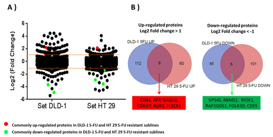 (A) Scatter plot figure showing dispersion of log2-fold change ratios for 3003 proteins commonly quantified in parent cell lines and 5-FU-resistant sublines. All proteins with a log2-fold change higher than ±1 were considered as altered proteins in resistant sublines. Commonly up-regulated (red) and down-regulated (green) proteins in both 5-FU-resistant sublines are highlighted. (B) Venn diagrams showing significantly up-regulated and down-regulated proteins in resistant sublines DLD-1/5-FU and HT-29/5-FU.