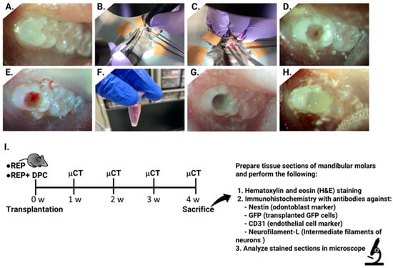 The REP was performed on the mandibular first molars of 10-week-old C57BL/6NCr mice in a similar manner as described previously [44] with some modifications. In our previous study, radiographic analysis showed that the roots reached maturity by 8–10 weeks [45]. The mice were subject to general anesthesia via intraperitoneal injection of a mixture of medetomidine hydrochloride (0.75 mg/kg; Dormitor, Zenoaq, Fukushima, Japan), midazolam (4.0 mg/kg; Sandoz, Novartis, Basel, Switzerland), and butorphanol tartrate (5 mg/kg; Meiji Seika Pharma, Chuo City, Tokyo, Japan). The surface of the first molar and surrounding tissues were disinfected with 70% ethanol (Figure 1A). Using a stereomicroscope, cavity preparation and access to the pulp chamber were achieved using a 1/4 round bur connected to a handpiece (Figure 1B). The pulp tissue was carefully removed, and mechanical instrumentation of the canals was performed using #6, #8, and #10 K files (Figure 1C). The canals were cleaned with 3% NaClO and 3% ethylenediaminetetraacetic acid (EDTA) and the excess was dried using a cotton pellet (Figure 1D). Intracanal bleeding was induced by rotating the #6 or #8 K file with slight force until bleeding was observed (Figure 1E). Subsequently, 1 × 105 DPCs were either transplanted into the bleeding canals (REP + DPC group) or the canals were left untreated (REP group) (Figure 1F). The cavity was filled with mineral trioxide aggregate (MTA) (Figure 1G) and sealed with a composite resin (CLEARFIL MAJESTY ES Flow, Tokyo, Japan) (Figure 1H). To avoid traumatic occlusion, the surface of the antagonist’s upper molar was flattened using a 1/4 round bur.