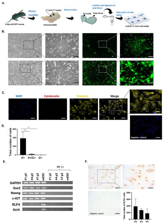 Isolation and characteristic analysis of mouse dental pulp cells (DPCs). (A) Dental pulp tissue was extracted from the mandibular molars of 5-day-old green fluorescent protein (GFP) transgenic mice. The tissue was incubated in enzymatic medium and DPCs were cultured in stem cell medium at 37 °C in a CO2-humidified incubator. (B) Morphological appearance and GFP expression of cultured DPCs after 1 day of culture (upper panels) and after the first passage (lower panels). Left panels are phase-contrast images (low magnification) and right panels are immunofluorescent images (high magnification). Scale bars = 100 µm. (C) Representative images of immunofluorescent staining of vimentin and cytokeratin in DPCs at 3rd passage. Scale bars = 100 µm (including the negative control) and 50 µm in the magnified area of the merged image. (D) Total number of vimentin+ (V+), vimentin+/cytokeratin+ (V+/C+), and cytokeratin+ (C+) cells quantified from 10 fields of vision with a 20× objective lens. Data are presented as means ± standard error of three different experiments using DPCs at passage 3. * p < 0.05. (E) Expression of stem cell marker genes detected by gel electrophoresis from three different samples of DPCs at the second and third passages. Mouse embryonic stem cells (mESCs) were used as a positive control. In the Oct4 row, the order for samples #1 and #4 is reversed. (F) Representative images of immunohistochemical staining of KLF4 in DPCs at the fourth passage. Scale bars = 100 µm and 50 µm in the magnified panel on the right and negative control. Quantification of KLF4-positive cells in DPCs from 10 fields of vision at high magnification from two independent experiments per passage time. Data are presented as means ± standard error of the mean.