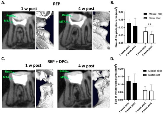 Micro-computed tomography (µCT) analysis of regenerative endodontic procedure (REP)- and REP + dental pulp cell (DPC)-treated molars. (A) Representative µCT images of sagittal sections and three-dimensional reconstructed images of molars from the REP (A) and REP + DPC (C) groups at 1 and 4 weeks after treatment. Measurement of the periodontal ligament (PDL) space (mm2) in the periapical area of the mesial and distal roots at 1 and 4 weeks in the (B) REP- (n = 22) and (D) REP + DPC-treated (n = 24) molars. Data are presented as means ± standard errors of the means. ** p < 0.01.