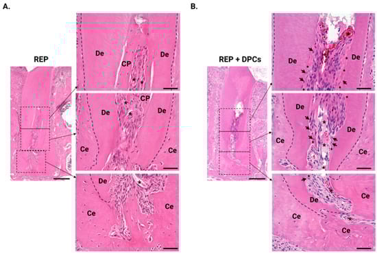 Representative images of the regenerated tissue in the regenerative endodontic procedure (REP) and REP + dental pulp cell (DPC) groups. (A) Regenerated pulp-like tissue in the REP group (distal root) comprising a cell-rich zone in the center of the canal with blood vessels surrounded by a thick eosin-stained cell-poor (CP) zone that resembles hard tissue. (B) In the REP + DPC group, the cell-rich zone is larger with abundant vessels, surrounded by a lining of eosin-stained tissue containing cells (n = 8 per group). Scale bars = 200 µm and 50 µm in the magnified panels on the right. De: dentin, CP: cell-poor zone, Ce: cementum. Asterisks: vessels, stars: regenerated dentin-like tissue; arrows: cells embedded in dentin-like tissue.