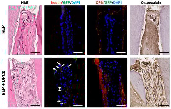 The dentin–pulp matrix is a complex structure with an ensemble of cells, including odontoblasts, fibroblasts, and immune cells, which work together to maintain homeostasis. As the odontoblasts play the fundamental role of dentin production [1], it is thus desirable for the regenerated dental pulp to contain these cells to be considered a true pulp–dentin complex. To detect the presence of odontoblast-like cells in the regenerated tissue, we stained the tissues with nestin antibody (an odontoblast marker) in combination with GFP antibody to confirm whether the transplanted cells differentiated into odontoblast-like cells. Nestin-positive cells were not detected in most of the REP group, even in samples with a broad cell-rich zone (Figure 5, upper panels and Supplementary Figure S1A), with one sample showing small negligible staining in the mesial root. Unsurprisingly, GFP was also not detected since there was no transplantation of DPC cells from GFP mice in this group. A clear-cut contrast was seen in the REP + DPC samples, where nestin and GFP co-expression was detected in the cell-rich zone of the canal (Figure 5, lower panels and Supplementary Figure S1B), confirming that the cells were derived from the transplanted DPCs that differentiated into nestin-expressing odontoblast-like cells. To further confirm the presence of odontoblasts in the regenerated tissue, we proceeded to perform IHC staining with OPN and osteocalcin antibodies, both non-collagenous proteins that are synthetized by odontoblasts [49,50,51]. Interestingly, robust OPN expression was seen in the cellular matrix in the samples of the REP + DPCs groups, both near and around the GFP+ cells, while in the REP groups it was readily detected in the periphery of this cell matrix (Figure 5 and Supplementary Figure S1). Osteocalcin could be observed in both groups, with intense staining in cells from some samples in the REP + DPC groups. Overall, the expression of these markers confirmed the presence of odontoblast-like cells and indicated that DPC transplantation in combination with REP resulted in a mineralized tissue that resembled the dentin matrix.