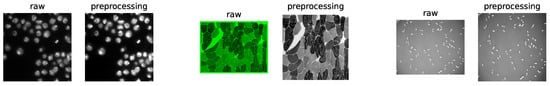 As shown in Table 3, three public datasets were selected to evaluate eight cell-segmentation software tools. The first dataset was extrapolated from the 2018 Data Science Bowl [35]; the second was obtained from Cellpose [21]; the third was obtained from the Cell Tracking Challenge of ISBI [36]. The general H5 format image files are easy to process and effectively reduce memory consumption. However, since Icy does not support the input of H5 format files yet, we did not choose the H5 format. Instead, we took another commonly used TIFF image format for conversion. Because CellProfiler and DeepCell require the same-size input dataset for batch processing, we unified the different sizes of the dataset to 512 × 512 px and converted them to a single channel (y,x,c) for grayscale processing. Specifically, the input dimensions of Plantseg were z, y, and x, and those of DeepCell were b, y, x, and c, where “bzxyc” denotes the number of images, depth, height–width, and color channel, respectively. Finally, we normalized the minimum and maximum values of each image in the dataset after removing the upper and lower 1% extremes. We were, thus, able to minimize the impact of these differences in the image brightness and contrast and to ensure the stability and Accuracy of the software cell segmentation. For examples, see Figure 1.