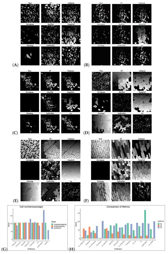 Some representative sections of the segmentation masks obtained after preprocessing the Cellpose_cyto dataset as shown in (A–F). (G) shows the cell numbers, and the suffix “*” indicates that the software had only successfully made segmentation predictions on preprocessed images. And (H) shows FP/TP/FN values, and the prefix “un_” indicates that the software operates on non-preprocess images.