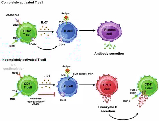 - Kaltenmeier, C.; Gawanbacht, A.; Beyer, T.; Lindner, S.; Trzaska, T.; Van der Merwe, J.A.; Harter, G.; Gruner, B.; Fabricius, D.; Lotfi, R.; et al. CD4+ T cell-derived IL-21 and deprivation of CD40 signaling favor the in vivo development of granzyme B-expressing regulatory B cells in HIV patients. J. Immunol. 2015, 194, 3768–3777. [Google Scholar] [CrossRef]