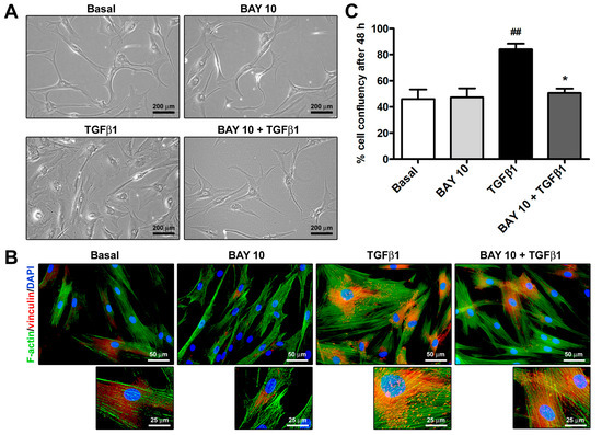As shown in Figure 2A, TGFβ1 treatment was able to induce a morphological change in human conjunctival fibroblasts, allowing them to acquire a myofibroblast-like phenotype characterized by larger dimensions and a highly flattened and polygonal-shaped cytoplasm. Moreover, after the challenge with TGFβ1, conjunctival fibroblasts underwent a rearrangement of the F-actin cytoskeleton, which displayed more abundant stress fibers, and there was a formation of vinculin-positive focal adhesions (Figure 2B). Notably, preincubation with BAY 41-2272 10 μM dampened the abovementioned TGFβ1-induced changes in cell morphology and cytoskeletal arrangement (Figure 2A,B). The high confluency percentage of TGFβ1-treated cells further confirmed the ability of TGFβ1 to enhance both cell proliferation and size (Figure 2C). Conversely, cell confluency of conjunctival fibroblast cultures preincubated with BAY 41-2272 10 μM before stimulation with TGFβ1 was similar to that of cultures at basal condition (Figure 2C).