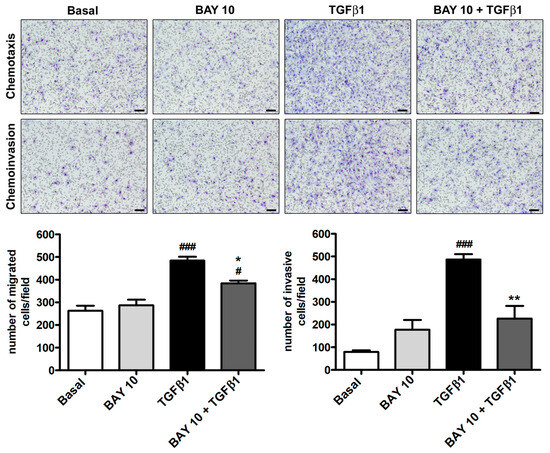 Human conjunctival fibroblasts’ capability to migrate and invade a polymeric ECM (i.e., Geltrex) was evaluated by means of the Boyden chamber method. As presented in Figure 4, with respect to the basal condition, neither cell migration nor invasiveness were affected by administration of BAY 41-2272 10 μM alone to conjunctival fibroblasts, while they significantly increased upon stimulation with TGFβ1. Notably, cell preincubation with BAY 41-2272 was able to significantly lessen the number of both migrated and invasive conjunctival fibroblasts (Figure 4).
