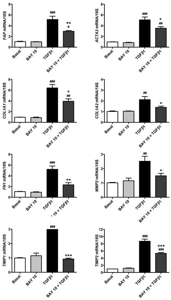 Quantitative real-time PCR performed on human conjunctival fibroblasts challenged with TGFβ1 alone showed a significant increase in gene expression of FAP, ACTA2, COL1A1, COL1A2, FN1, MMP2, TIMP1, and TIMP2 (Figure 5). Notably, cell pretreatment with the sGC stimulator BAY 41-2272 10 μM significantly lowered TGFβ1-induced mRNA levels of all the abovementioned genes (Figure 5).