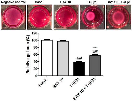 The sGC stimulator BAY 41-2272 significantly dampens the TGFβ1-induced contractile ability of human conjunctival fibroblasts. Representative wells of the collagen gel contraction assay are shown. Every experimental point was performed in triplicate. Histograms represent the mean ± SEM of gel sizes expressed as the percentage of those observed in wells with cells at basal condition. ### p < 0.001 vs. basal condition, ** p < 0.01 vs. TGFβ1 (Tukey’s test). SEM, standard error of the mean; sGC, soluble guanylate cyclase; TGFβ1, transforming growth factor β1.