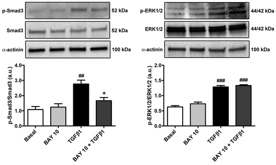Considering that Smad3 phosphorylation and ERK1/2 phosphorylation represent important steps of the TGFβ1-mediated canonical and non-canonical pathways, respectively, we next evaluated the protein levels of both phosphorylated-Smad3/total Smad3 and phosphorylated-ERK1/2/total ERK1/2 in the different experimental conditions. Conjunctival fibroblast stimulation with TGFβ1 alone significantly augmented both Smad3 and ERK1/2 protein phosphorylation (Figure 9). Of note, cell pretreatment with BAY 41-2272 10 μM significantly lessened only phosphorylated-Smad3, reaching levels comparable to those of the basal condition (Figure 9).