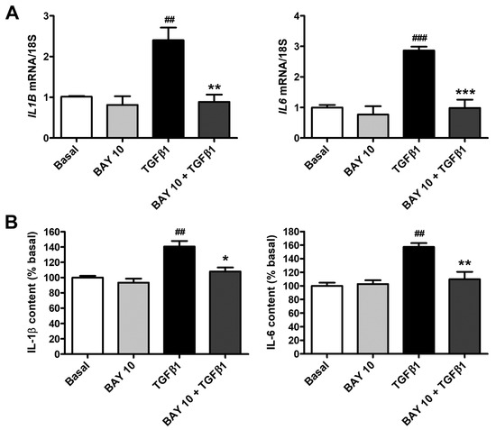 As reported in Figure 10A, TGFβ1 stimulation determined a strong upregulation of both IL1B and IL6 mRNA levels, an effect that was significantly lowered by BAY 41-2272 10 μM pretreatment. In agreement with these results, IL-1β and IL-6 levels were found to be significantly augmented in the supernatants of TGFβ1-treated conjunctival fibroblasts and resulted strongly decreased in cells pretreated with BAY 41-2272 10 μM (Figure 10B). In particular, the levels of IL-1β and IL-6 secreted by conjunctival fibroblasts pretreated with BAY 41-2272 and then stimulated with TGFβ1 were both like those measured in the supernatants of basal cells (Figure 10B).