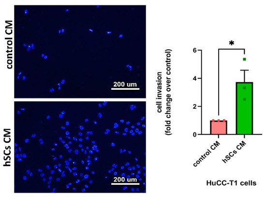 Human SC-conditioned medium fosters the invasiveness of HuCC-T1 cells in a Matrigel invasion assay. Micrographs and related diagrams show the higher propensity of HuCC-T1 cells to invade Matrigel when exposed to hSC CM with respect to control CM. Student’s t-test: * = p ≤ 0.05. N = 3.