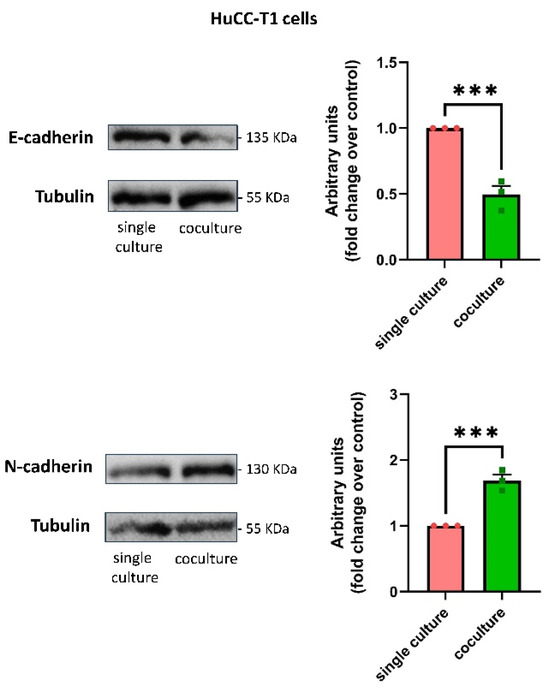 Cadherin switch in HuCC-T1 cells cocultured with hSCs. Western blot analyses of E-cadherin and N-cadherin expression in HuCC-T1 cells cocultured with hSCs. The figure shows the downregulation of the epithelial marker E-cadherin and the coherent upregulation of the mesenchymal marker N-cadherin. The graphs depict the results of densitometric analyses. Student’s t-test: *** p ≤ 0.001. N = 3.