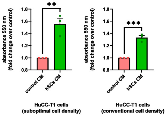 Cell viability assay in hSC CM-treated HuCC-T1 cells. The graphs show viability according to MTT assay in HuCC-T1 cells treated with hSC CM or control CM. Cell viability is higher in samples treated with hSC CM with respect to control at both conventional and suboptimal cell densities. Student’s t-test: ** p ≤ 0.01; *** p ≤ 0.001. N = 3.