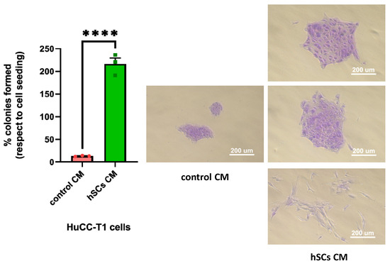 Clonogenic assay in hSC CM-treated HuCC-T1 cells. The graph shows higher percentage of colonies formed with respect to initial seeding in HuCC-T1 cells treated with hSC CM compared to the control. Student’s t-test: **** p ≤ 0.0001. N = 3. The micrographs show the different morphology of the colonies formed by cells treated with hSC CM and control CM.