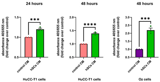 Proliferation assay in hSC CM-treated HuCC-T1 and Oz cells. The graphs show increased proliferation of both cell lines treated with hSC CM compared to control CM. Student’s t-test: *** p ≤ 0.001 **** p ≤ 0.0001. N = 3.