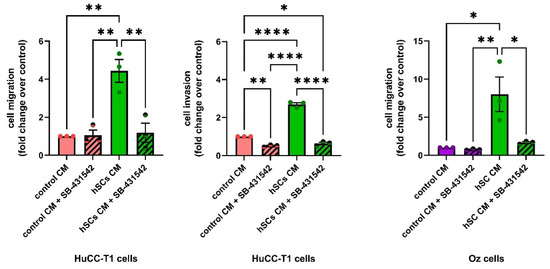 Migration and invasion assays in the presence of TGFBR1 antagonist treatment. Migration and invasion assays were performed in iCCA cells treating HuCC-T1 or Oz cells with the TGFBR1 antagonist (10 μM SB-431542). The graphs show that the antagonist completely reverts the effects of hSC CM. One-way ANOVA * p ≤ 0.05; ** p ≤ 0.01; **** p ≤ 0.0001. N = 3.
