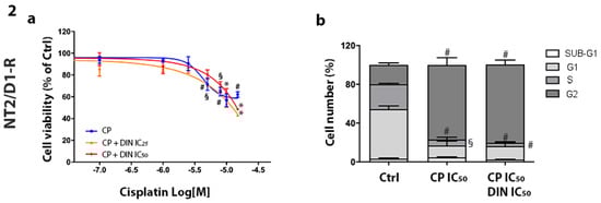 | NT2/D1-R | 36,301 (32,866–40,096) | 30,668 (27,332–34,411) p < 0.01 vs vehicle | 25,436 (23,305–27,762) p= 0.030 vs vehicle | 19,732 (17,814–21,856) p < 0.01 vs vehicle p < 0.01 vs cisplatin |
