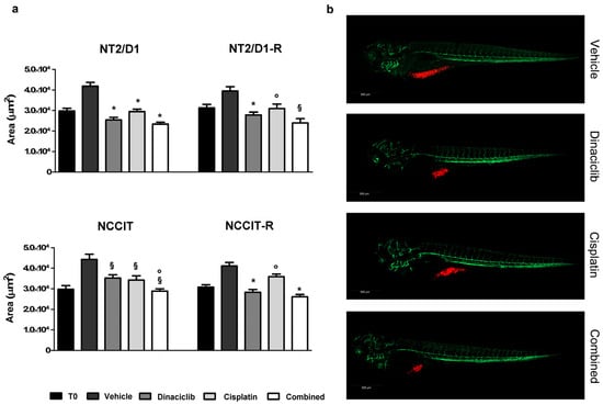 3.4. Effect of Dinaciclib Alone or Combined with Cisplatin in the Zebrafish/Tumor Xenograft Model