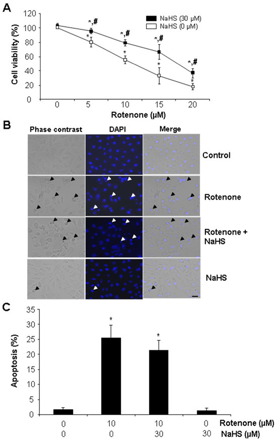 The effects of rotenone and NaHS on cell viability of cultured rat cardiac cells (H9C2) was first tested with MTT assay. Rotenone inhibited cell viability in a dose-dependent manner. The cell viability in 10 µM rotenone-treated cells was only 60% of the control cells. Rotenone at 20 µM inhibited cell viability by 80% (Figure 1A). Exogenously applied H2S at physiological relevant concentration (30 µM) significantly restored rotenone-reduced cell viability at all the tested doses (Figure 1A). Next, DAPI was used to stain the cells for observing nucleus-condensed apoptotic cells. As shown in Figure 1B,C, rotenone at 10 µM induced a higher rate (25%) of apoptosis, which was not changed by co-incubation with 30 µM NaHS. NaHS alone had no effect on apoptosis. These data suggest that H2S-protected cell death by rotenone may be independent of apoptosis.
