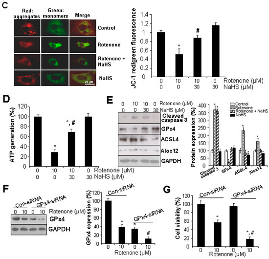 H2S reversed rotenone-induced ferroptosis. In (A–E), cells were incubated with 10 µM rotenone in the presence or absence of 30 µM NaHS for 24 h. Cells were then subjected for (A) ROS measurement with a fluorescent probe H2DCFDA, (B) lipid peroxidation by measuring the contents of MDA, (C) mitochondrial membrane potential change with JC-1 staining, (D) ATP generation with an ATP bioluminescent assay kit, (E) and protein expressions by Western blotting. *, p < 0.05 versus the control cells; #, p < 0.05 versus the cells treated with rotenone only. The experiments were repeated four times. In (F,G) the cells were transected with GPx4-siRNA for 24 h followed by incubation with 10 µM rotenone for an additional 24 h, (F) GPx4 expression and (G) cell viability were then measured. *, p < 0.05 versus control siRNA (con-siRNA)-transfected cells without rotenone treatment; #, p < 0.05 versus GPx4 siRNA-transfected cells without rotenone treatment. Experiments were repeated three times.