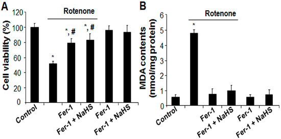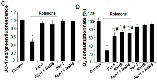 Fer-1 inhibited rotenone-induced ferroptosis. After cells were incubated with 10 µM rotenone in the presence or absence of 10 µM Fer-1 and/or 30 µM NaHS for 24 h, cells were subjected to (A) cell viability assay with MTT, (B) lipid peroxidation by measuring the contents of MDA, (C) mitochondrial membrane potential change with JC-1 staining, and (D) oxygen (O2) consumption rate with a mitochondrial stress test kit. * p < 0.05 versus control cells; # p < 0.05 versus cells treated with rotenone only. Experiments were repeated four times.
