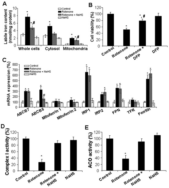 Ferroptosis is a regulated cell death driven by iron-dependent lipid peroxidation [18,38]. To further investigate how H2S protects from rotenone-induced ferroptosis, labile iron levels were measured with a ferrozine colorimetric assay. Figure 4A showed that labile iron level in whole cell lysates from rotenone-treated cells was about 2.6 times that in control cells, which would be significantly reduced by NaHS co-incubation. Further analysis of cytosolic and mitochondrial fractions demonstrated that rotenone induced more labile iron level in mitochondria (6.7 times of the control) than that in cytosol (1.9 times of the control). In comparison to the cells treated with rotenone, NaHS completely brought labile iron to the same level as control cells in cytosol, but only partially attenuated labile iron level in mitochondria (Figure 4A). Deferiprone (DFP), an iron chelator, would also significantly attenuate rotenone-inhibited cell viability by 40% (Figure 4B), pointing to the possible mediation of iron overload in rotenone-induced ferroptosis. To explore the mechanisms underlying the induction of labile iron level by rotenone, several iron metabolism-related genes were analyzed by real-time PCR. As shown in Figure 4C, the mRNA expressions of ABCB7, ABCB8, IRP1, IRP2, FPN, and ferritin in rotenone-incubated cells were significantly higher than those in the control cells. The co-incubation with NaHS only inhibited rotenone-induced ABCB8, but no other genes. In addition, the mRNA levels of mitoferrin 1, mitoferrin 2, and TFR were not affected by either rotenone and/or NaHS. Mitochondrial complex I activity has the largest number of iron-sulfur (Fe-S) cluster-containing proteins in the electron transport chain, which is known to be inhibited by rotenone [26]. ACO contains a [4Fe-4S]-cluster and is an essential enzyme in the citric acid cycle [7]. We further observed that rotenone markedly inhibited the activities of mitochondrial complex I (Figure 4D) and ACO (Figure 4E), both of which could be decreased by NaHS co-incubation. These data suggest that H2S may improve cellular iron balance by maintaining the stability of Fe-S cluster.