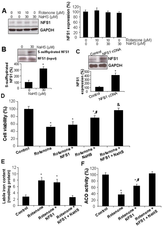 NFS1 overexpression enhanced the protective role of H2S against rotenone-induced cell death and labile iron level. (A) NFS1 was not affected by either rotenone or H2S. After cells were incubated with 10 µM rotenone in the presence or absence of 30 µM NaHS for 24 h, they were collected for Western blotting analysis of NFS1 expression. (B) NFS1 was S-sulfhydrated by H2S. After cells were incubated with 30 µM NaHS for 24 h, they were collected for biotin switch detection of NFS1 S-sulfhydration. *, p < 0.05 versus control cells. In (C–F), cells were transfected with NSF1 cDNA in the presence or absence of 10 µM rotenone and/or 30 µM NaHS for 24 h. Cells were then subjected to (C) NFS1 protein expression by Western blotting, (D) cell viability by MTT assay, (E) labile iron measurement with ferrozine colorimetric assay, and (F) measurement of ACO activity. * p < 0.05 versus control cells; # p < 0.05 versus cells treated with rotenone only. Experiments were repeated three times.