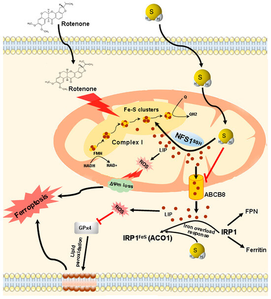 In summary, this study found that rotenone destabilizes Fe-S clusters, stimulates labile iron level and oxidative stress, and damages mitochondrial functions, which eventually leads to cell death. H2S blocks rotenone-induced ferroptosis by inhibiting ABCB8-mediated iron efflux from mitochondria to cytosol and inducing NFS1-mediated Fe-S cluster biogenesis (Figure 7). These results indicate that H2S would protect cardiac cells from ischemic damage through preserving mitochondrial functions and intracellular Fe-S cluster homeostasis.