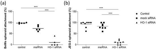 Percentage (%) of attachment of (a) BeWo (n = 5) or (b) JEG-3 trophoblast spheroids (n = 8) to a monolayer of RL-95 endometrial epithelial cells. Control: cells without treatment; msiRNA: cells transfected with 0.2 nM Silencer® Select Negative Control siRNA; HO-1 siRNA: cells transfected with 0.2 nM Silencer® Select HO-1 siRNA. Statistical analysis was performed using one-way ANOVA with the Bonferroni correction for multiple testing. *** p < 0.001.