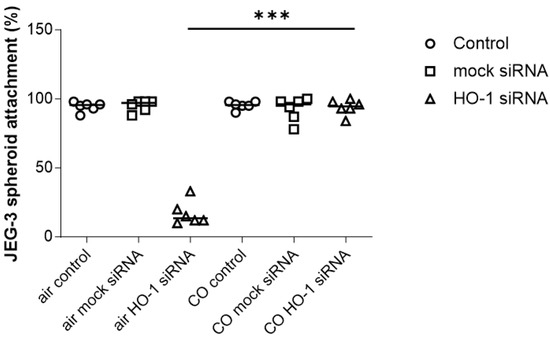 We confirmed our initial observations proving that HO-1 knockdown in JEG-3 spheroids by means of HO-1 siRNA reduced spheroid attachment to 17.00% compared to the 55.00% attachment rate after mock siRNA treatment or to the 94.33% attachment rate without siRNA treatment (Figure 2). Interestingly, when cells were in the presence of 500 ppm CO, the effect observed due to HO-1 knockdown was reverted (Figure 2), as the attachment rates for the spheroids without siRNA, with mock siRNA and even with HO-1 siRNA were 95.33%, 92.50% and 94.00%, respectively, in the presence of CO. This indicates that CO may be sufficient to overcome the lack of HO-1 in the process of spheroid attachment.