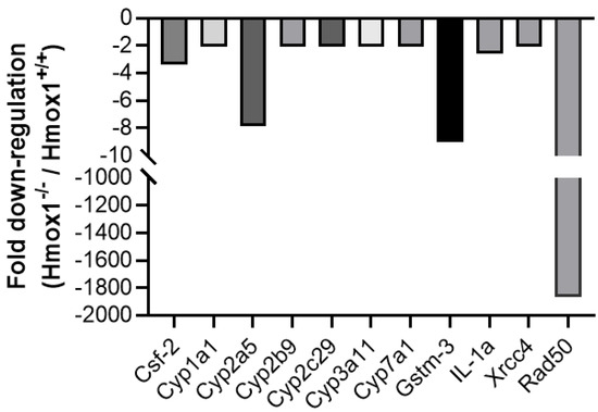 We next aimed to analyze which molecules are differently expressed in vivo as a consequence of HO-1’s absence. For this, we used uterine tissue from Hmox1−/− vs. Hmox1+/+ mice. The Mouse Stress and Toxicity PathwayFinder™ RT2 Profiler™ PCR Array showed a strong downregulation of the RAD50 double strand break repair protein (Rad50, 1867-fold down-regulation) and glutathione-S-transferase M3 (Gstm3; 9-fold down-regulation) in Hmox1−/− uteruses when compared to Hmox1+/+ uteruses. As expected, no expression of Hmox1 was found in Hmox1−/− uteruses. Other genes that showed a >2-fold downregulation were: Xrcc4, Il1, Cyp7a1, Cyp2b9, Cyp2c29, Cyp3a11, Cyp2a5, Cyp1a1 and Csf2 (Figure 3).