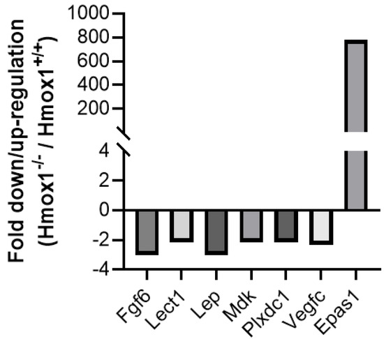As for the other genes that are downregulated in Hmox1−/− uteruses, such as Fgf6, Lect1, Lep, Mdk, Plxdc1 and Vegfc, only Fgf6 and Lep show a >2-fold downregulation in Hmox1−/− uteruses when compared to Hmox1+/+ uteruses. The Fgf6 gene encodes for fibroblast growth factor 6 (FGF6), which is a member of the FGF family. FGF proteins are potent mitogens that promote angiogenesis [36]. Having found a downregulation in the expression of Fgf6 in Hmox1−/− uteruses strongly suggests that angiogenesis may be altered in Hmox1−/− animals. Surprisingly, there is limited information on FGF6 expression in uteruses or its relation to HO-1, warranting further in-depth investigation.