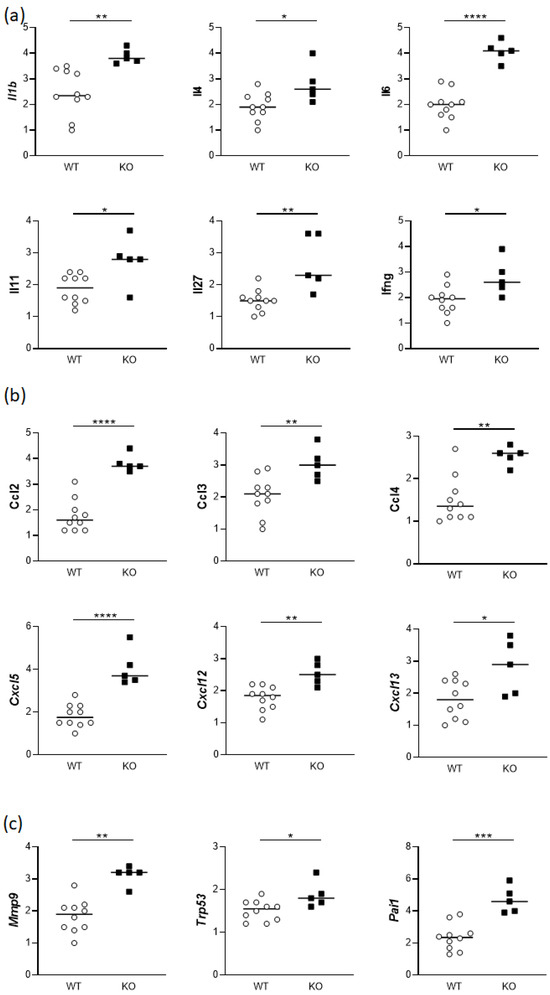 Gene expression of (a) cytokines, (b) chemokines, and (c) Mmp9, Trp53, and Serpine1 in the uteruses of gd14 females. WT: Hmox1+/+ mice (n = 10); KO: Hmox1−/− mice (n = 6). Gene expression was normalized to reference genes (Actb, Gapdh, Rplp0, and Ubc). Statistical differences were analyzed by unpaired t-test. * p <0.05; ** p <0.01; *** p < 0.001; **** p < 0.0001.