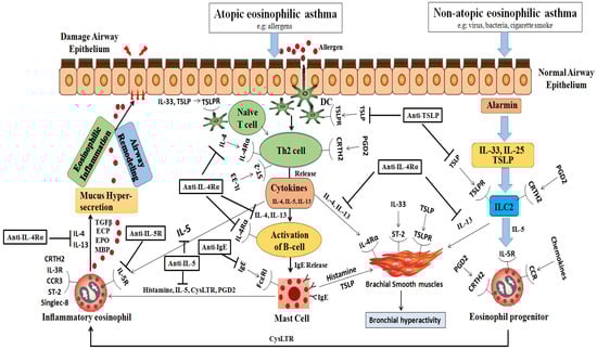 Both Th2 cells (in atopic eosinophilic asthmatics) and ILC2 cells (in nonatopic eosinophilic asthmatics) lead to robust downstream production of type 2 cytokines, particularly IL-4, IL-5, and IL-13. These cytokines are associated with airway eosinophilia, tissue damage, mucous hypersecretion, chronic airway inflammation, and asthma exacerbations. In atopic eosinophilic asthma, IL-4 plays a pivotal role in differentiating naive CD4+ T cells into Th2 cells, promoting the secretion of IL-5 and IL-13, the switching of allergen-specific B cells, and the production of IgE antibodies. IgE interacts with a high-affinity receptor (FcεRI) on the mast cells, leading to mast cell degranulation/activation and the release of mediators such as PGD2, tryptase, and protease, which are associated with increased vascular permeability and vasodilation. Additionally, IL-5 triggers a cascade of intracellular signaling events that are associated with eosinophil recruitment, maturation, activation, and survival, as well as inducing eosinophilic inflammation through the release of toxic granules and cysteinyl leukotrienes [21]. The key signaling molecules in this pathway include PI3K [22]; JAK2; STAT1, 3, and 5 [23]; NF-κB; and MAPK [24]. IL-13 exhibits a versatile role in asthma pathogenesis, including inducing iNOS (inducible nitric oxide synthase) expression, FENO production, mucous hypersecretion, and bronchial hyperactivity by stimulating bronchial smooth muscle cell contraction. In atopic eosinophilic asthma, the cytokines secreted from the mast cells and Th2 cells, particularly IL-4 and IL-13, which share the IL-4Rα receptor, synergistically promote eosinophil recruitment by increasing the expression of adhesion molecules on the endothelial cells and inducing the production of chemokines (eotaxins) by the epithelial cells. The cross-talk between the mast cells and bronchial smooth muscle cells, involving TSLP, histamine, and IL-33, contributes to bronchial hyperactivity.