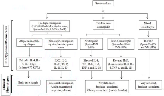 Based on the composition of the inflammatory cells and the mediators involved, such as T helper 2 (Th2) cells and type 2 cytokines, two primary endotypes of severe asthma have been identified: Th2-high eosinophilic asthma and Th2-low (or non-Th2) non-eosinophilic asthma (neutrophilic asthma). This distinction is crucial for guiding targeted treatment strategies and understanding the underlying mechanisms of different asthma presentations [48].