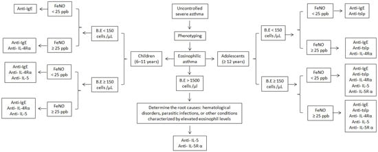 The selection of appropriate biologic medication for eosinophilic asthma is based on patient age and biomarker levels, focusing on phenotypic characterization, including blood eosinophil counts and FENO levels. This selection process is depicted in the algorithm presented in Figure 3. The absence of direct head-to-head comparison trials for biologics and the lack of conclusive evidence to rank specific biologics in order of efficacy complicates the decision-making process.