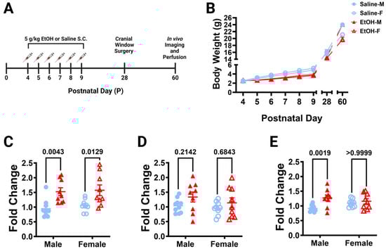 Dosing paradigm, mouse weights, and P10 mRNA expression. (A) Timeline of third-trimester equivalent dosing. Pups were subcutaneously given 5.0 g/kg/day of either ethanol solution or saline twice a day, two hours apart. Mice were aged to adolescence (~P28) and cranial windows were implanted over lobule IV/V of the cerebellar vermis. Some animals underwent in-vivo imaging at this age as reported in [24]. They were further aged to young adulthood (~P60) and underwent in-vivo two-photon imaging, followed by fixation. Brains were harvested, sectioned, and imaged on a confocal microscope. (B) Mice were weighed every day before dosing (saline 9M; 7F, ethanol 8M; 6F), as well as before surgery and perfusion. When sexes were pooled, there was a main effect of age (F (1.791, 50.16) = 1757, p < 0.0001) and main effect of treatment (F (1, 28) = 8.182, p = 0.0079) on body weight over time, and a trend towards an interaction between age and treatment (F (7, 196) = 1.980, p = 0.0596). Saline-dosed animals gained weight every day (p < 0.0001) and ethanol-dosed animals gained weight every day (p < 0.05), except for P4–P5 (p > 0.99) when sexes were pooled. From P7–P9, saline-dosed pups weighed significantly more than ethanol-dosed pups (p < 0.05), but there were no significant differences in weight between saline- and ethanol-dosed animals at any other ages (p > 0.05) when sexes were pooled. Saline-dosed males weighed significantly more than ethanol-dosed males at P28 (p = 0.0226), but not any other ages (p > 0.05). There were no significant differences between saline- and ethanol-dosed female (p > 0.05) weights at any age. (C–E) The effect of P4–P9 developmental ethanol exposure on the P10 (24 h after the final dose of ethanol) cerebellum in a separate cohort of mice (saline 10M; 9F, ethanol 9M; 9F) was examined for IL-1β (C), TNF-α (D), and CCL2 (E) mRNA expression. (C) IL-1β expression was significantly increased in ethanol-dosed pups (F (1, 33) = 19.44, p = 0.0001), an effect that was significant for both males (p = 0.0043) and females (p = 0.0129). There was no main effect for sex (F (1, 33) = 0.4066, p = 0.5281), and no treatment–sex interaction (F (1, 33) = 0.05975, p = 0.8084). (D) There was a trend for increased TNF-α expression in ethanol pups (F (1, 33) = 3.409, p = 0.0738), but no main effect for sex (F (1, 33) = 1.161, p = 0.2892), and no treatment–sex interaction (F (1, 33) = 0.2171, p = 0.6443). (E) CCL2 expression was significantly increased in ethanol-dosed pups (F (1, 33) = 8.859, p = 0.0054) and there was a significant treatment–sex interaction (F (1, 33) = 4.317, p = 0.0456), as the effect was significant in males (p = 0.0019), but not females (p ≥ 0.9999). There was no main effect for sex (F (1, 33) = 0.1921, p = 0.6641). (B–E) Males (M) are shown with closed shapes and females (F) with open shapes. Data are presented as the mean ± SEM. (B) Each datapoint represents a treatment group and sex. Two-way ANOVA, repeated measures with Bonferroni post-hoc comparisons. (C–E) Each datapoint represents an individual animal. Two-way ANOVA with Bonferroni post-hoc comparisons.