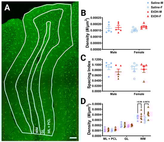 Cerebellar microglia density and distribution in lobule IV/V. (A) 10× confocal stitched image of lobule IV/V of the vermis. White lines indicate different layers (Molecular Layer (ML)+ Purkinje Cell Layer (PCL) combined, Granule Layer (GL), White Matter (WM)). (B) For the entire lobule IV/V (all layers combined), microglia density (number of microglia/μm2) was unchanged between saline-dosed (5M, 5F) and ethanol-dosed (5M, 5F) mice. There was no main effect for treatment (F (1, 16) = 1.836, p = 0.1943) or sex (F (1, 16) = 0.02769, p = 0.8699), and no interaction between treatment and sex (F (1, 16) = 0.6661, p = 0.4264). (C) For the entire lobule IV/V (all layers combined), the microglia spacing index ((nearest neighbor)2xmicroglia density) was unchanged between saline-dosed (5M, 5F) and ethanol-dosed (5M, 5F) mice. There was no main effect for treatment (F (1, 16) = 0.7948, p = 0.3859) or sex (F (1, 16) = 0.01861, p = 0.8932), and no interaction between treatment and sex (F (1, 16) = 0.6416, p = 0.4349). (D) When broken down by layer (ML + PCL, GL, WM), microglia density remained largely unaltered. In the ML and PCL combined, there was no main effect for treatment (F (1, 16) = 1.441, p = 0.2474) or sex (F (1, 16) = 0.01629, p = 0.9000), and no interaction between treatment and sex (F (1, 16) = 0.3860, p = 0.5432). In the GL, there was no main effect for treatment (F (1, 16) = 0.9490, p = 0.3445) or sex (F (1, 16) = 0.6814, p = 0.4213), and no interaction between treatment and sex (F (1, 16) = 0.1797, p = 0.6773). However, in the WM there was a trend towards increased microglia density in ethanol-dosed animals (F (1, 16) = 3.707, p = 0.0722), with a trend in females (p = 0.0674), but not males (p > 0.99). There was no main effect for sex (F (1, 16) = 0.03950, p = 0.8450) and no interaction between treatment and sex (F (1, 16) = 1.850, p = 0.1927). (B–D) Each datapoint represents an individual animal. Data are presented as the mean ± SEM. Two-way ANOVA with Bonferroni post-hoc comparisons. Scale bar = 100 μm.