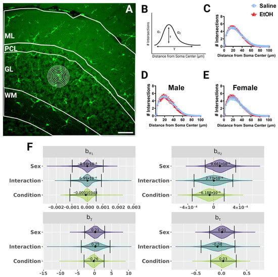 Cerebellar microglia morphology in lobule IV/V in fixed tissue. (A) 40× confocal image within lobule IV/V of the vermis. White lines indicate different layers (ML, PCL, GL, WM). Concentric rings were drawn with increasing radii around each microglia (example in GL) to examine process ramification. (B) Example Sholl curve graph. X axis corresponds to radii from the soma center (concentric circles in (A)) and y axis corresponds to process intersections across the circles. The Sholl curve is labeled with factors that give information about its behavior: before the change-point (α1); after the change-point (α2); branch maximum (eτ); change-point (γ) (from [24]). (C–E) Sholl curves for saline-dosed (5M, 5F) and ethanol-dosed (5M, 5F) mice for all layers combined when sexes were combined (C) or separated into males (D) and females (E) show no differences in ramification. (F) Individual Sholl curves were fit using a hierarchical Bayesian approach to capture variation at each level of the experimental hierarchy. Credible intervals of 95% for effects on each parameter from (B) were calculated across treatments and sexes when all layers were combined. (C–E) Each datapoint represents a treatment group and sex. Data are presented as the mean ± SEM. Scale bar = 50 μm.