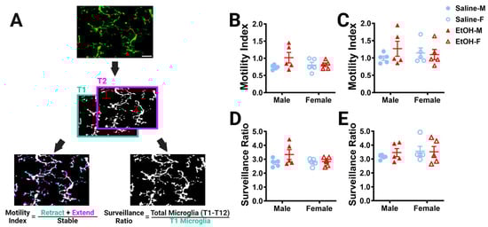 While we observed no differences in microglial density or morphology after developmental ethanol exposure using static analyses in fixed tissue, many microglial roles rely on the ability of their motile processes to explore their surroundings and interact with other cell types [43]. In young adulthood, we used 2p in-vivo imaging to examine cerebellar microglia dynamics in the ML and PCL. For each of our L7cre/Ai9+/−/Cx3cr1G/+ male and female mice, which have fluorescently labeled microglia, we took a 101 μm z-stack including both the ML and PCL every 5 min for an hour, to collect a total of 12 time points for each animal. To examine whether developmental ethanol exposure affected how microglial processes survey the parenchyma over time in adulthood, the motility index (Figure 4A) was analyzed for microglia in the ML (Figure 4B) and PCL (Figure 4C). No differences between ethanol and saline or males and females were found in either layer. Similarly, no changes were found for the surveillance ratio (Figure 4A), a measure of how much parenchyma microglial processes explore in a one-hour period, in either the ML (Figure 4D) or PCL (Figure 4E).