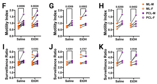 Because microglia in the ML and the PCL have been reported to have differences in their motility and surveillance, we compared these measures across the two layers in the same animal (Figure 4F–K) [24,28,32]. As expected, PCL microglia were found to be generally more motile than ML microglia in both saline- and ethanol-dosed animals when sexes were combined (Figure 4F) or separated into males (Figure 4G) and females (Figure 4H). Similarly, PCL microglia surveyed significantly more area than ML microglia in both saline- and ethanol-dosed mice when sexes were pooled (Figure 4I). In males, only saline-dosed mice had a significantly higher surveillance ratio in PCL compared to the ML (Figure 4J). There were trends towards higher surveillance in the PCL versus the ML in both saline- and ethanol-dosed females (Figure 4K). This suggests that layer-specific regulation of microglial dynamics is maintained from adolescence to young adulthood and is unaffected by developmental ethanol exposure.