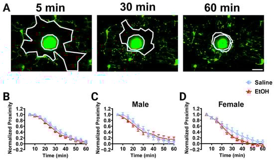 While microglial dynamics were unaffected by developmental ethanol exposure, we wanted to examine whether other microglial functions may be affected. Microglia respond to infection, insult, and injury, and changes in their ability to respond to pathological stimuli have been observed after developmental perturbations, including potentially after ethanol exposure [30,31,44,45]. To determine whether developmental ethanol exposure affects the ability of microglia to respond to focal injury in adulthood, we examined the dynamic chemotaxis of microglial processes to a laser ablation in vivo. A laser ablation was created using a high-intensity brief laser pulse to the brain parenchyma away from visible microglial processes, and the convergence of microglial processes on this ablation was monitored over 60 min (Figure 5A). To quantify the response, the area between the “front” of the microglial processes and injury core was calculated over time as the normalized proximity. Microglial processes converged on the laser ablation over 60 min in all experimental groups, as shown by decreases in the normalized proximity over time (Figure 5B–D). We did not observe differences in the convergence between experimental groups when the sexes were pooled (Figure 5B) or in males (Figure 5C) or females (Figure 5D). While not significant for our analysis, ethanol-dosed females qualitatively appear to converge on the core faster than saline-dosed females (Figure 5D).