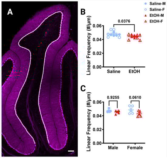 Cerebellar Purkinje cell linear frequency in lobule IV/V. (A) 10× confocal stitched image of lobule IV/V of the vermis. White line indicates the length of the PCL. (B,C) Purkinje cell linear frequency (number of Purkinje cells divided by the length of the PCL) was significantly lower in ethanol-dosed animals when sexes were combined ((B), p = 0.0376) and when separated by sex ((C), F (1, 16) = 4.884, p = 0.0420), although this effect seemed to be caused by females where the post-hoc test showed a trend towards significance (p = 0.0610), whereas it did not in males (p = 0.9255). There was no main effect of sex (F (1, 16) = 0.1277, p = 0.7255) and no interaction between treatment and sex (F (1, 16) = 1.313, p = 0.2687). (B,C) Each datapoint represents an individual animal. Data are presented as the mean ± SEM. (B) Unpaired t-test. (C) Two-way ANOVA with Bonferroni post-hoc comparisons. Scale bar = 100 μm.