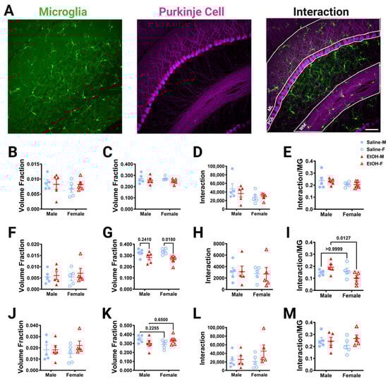 Cerebellar microglia–Purkinje cell interactions in lobule IV/V in fixed tissue. (A) 40× confocal images within lobule IV/V of the vermis showing microglia (left), Purkinje cells (middle), and composite (right). White lines indicate different layers that were analyzed (ML (B–E), PCL (F–I), WM (J–M)). (B,C,F,G,J,K) The number of microglia (B,F,J) or Purkinje cell (C,G,K) pixels was divided by the volume of either the ML (B,C), PCL (F,G), or WM (J,K) to obtain the volume fraction. The microglial volume fraction was unaltered in all layers. There was no main effect for treatment in the ML ((B); F (1, 16) = 0.1135, p = 0.7406), PCL ((F); F (1, 16) = 0.3775, p = 0.5476), or WM ((J); F (1, 16) = 0.8330, p = 0.3750). There was no main effect for sex in the ML ((B); F (1, 16) = 0.7162, p = 0.4099), PCL ((F); F (1, 16) = 0.07930, p = 0.7819), or WM ((J); F (1, 16) = 0.005239, p = 0.9432). There was no interaction between treatment and sex in the ML ((B); F (1, 16) = 0.5903, p = 0.4535), PCL ((F); F (1, 16) = 0.09619, p = 0.7605), or WM ((J); F (1, 16) = 0.8679, p = 0.3654). For Purkinje cell volume fraction, there was no main effect for treatment in the ML ((C); F (1, 16) = 1.897, p = 0.1874) or WM ((K); F (1, 16) = 0.001421, p = 0.9704). However, there was significantly less Purkinje cell volume fraction in the PCL in ethanol-dosed mice compared to saline-treated mice ((G); F (1, 16) = 10.63, p = 0.0049), an effect which was significant in females (p = 0.0180), but not males (p = 0.2410). There was no main effect for sex in the ML ((C); F (1, 16) = 0.1437, p = 0.7096), PCL ((G); F (1, 16) = 0.07170, p = 0.7923), or WM ((K); F (1, 16) = 0.2196, p = 0.6457). There was no interaction between treatment and sex in the ML ((C); F (1, 16) = 0.2023, p = 0.6589) or PCL ((G); F (1, 16) = 0.8862, p = 0.3605). However, there was a trend towards a treatment–sex interaction effect for the Purkinje cell volume fraction in the WM ((K); F (1, 16) = 3.628, p = 0.0750). (D,H,L) The number of pixels representing the overlap between the microglia and Purkinje cell pixels was unaltered by ethanol exposure in every layer. For microglia–Purkinje cell interactions, there was no main effect for treatment in the ML ((D); F (1, 16) = 0.3242, p = 0.5770), PCL ((H); F (1, 16) = 0.0009879, p = 0.9753), or WM ((L); F (1, 16) = 1.703, p = 0.2103). There was no main effect for sex in the ML ((D); F (1, 16) = 2.718, p = 0.1187), PCL ((H); F (1, 16) = 0.1628, p = 0.6920), or WM ((L); F (1, 16) = 0.6698, p = 0.4251). There was no interaction effect between treatment and sex in the ML ((D); F (1, 16) = 0.5222, p = 0.4804), PCL ((H); F (1, 16) = 0.002974, p = 0.9572) or WM ((L); F (1, 16) = 1.282, p = 0.2742). (E,I,M) The number of pixels representing the overlap between the microglia and Purkinje cell pixels was also normalized to the number of the microglia pixels to determine microglia–Purkinje cell interaction. For microglia–Purkinje cell interactions normalized to microglia pixels, there was no main effect for treatment in the ML ((E); F (1, 16) = 0.05929, p = 0.8107), PCL ((I); F (1, 16) = 0.08791, p = 0.7707), or WM ((M); F (1, 16) = 0.8391, p = 0.3732). There was no main effect for sex in the ML ((E); F (1, 16) = 2.472, p = 0.1354) or WM ((M); F (1, 16) = 0.09420, p = 0.7629). However, in the PCL (I), there was a trend towards a decrease in microglia–Purkinje cell interactions in females compared to males (F (1, 16) = 3.572, p = 0.0770) and there was a significant treatment–sex interaction (F (1, 16) = 6.499, p = 0.0214), with female ethanol-dosed mice having fewer microglia–Purkinje cell interactions than male ethanol-dosed mice (p = 0.0127). There was no interaction effect between treatment and sex in the ML ((E); F (1, 16) = 0.01089, p= 0.9182) or WM ((M); F (1, 16) = 1.229, p = 0.2841). (B–M) Each datapoint represents an individual animal. Data are presented as the mean ± SEM. Two-way ANOVA with Bonferroni post-hoc comparisons. Scale bar = 50 μm.