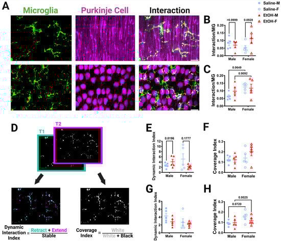 In the ML, the volume fractions for the whole microglia and microglial processes, but not somas, were increased in females compared to males, significantly for whole microglia and with a trend for microglia processes (Figure S3B–D). Post-hoc testing revealed that these differences were due to trends towards a higher microglia volume fraction in ethanol females than ethanol males. Additionally, the volume fraction of the whole Purkinje cell or its subcomponents in the ML was not altered by sex or treatment (Figure S3I–K). We then examined the extent of interactions by normalizing them to the number of microglia pixels and averaging the normalized interactions across the 12 time points imaged in either the ML (Figure 8B and Figure S4A–D) or PCL (Figure 8C and Figure S4E,F). The interaction between microglia and Purkinje cells was measured for whole cells (Figure 8B) and each subcomponent type (microglia process–Purkinje cell dendrite, microglia soma–Purkinje cell dendrite, microglia process–Purkinje cell branch, microglia soma–Purkinje cell branch) (Figure S4A–D), then normalized to the number of microglia pixels. For whole microglia–whole Purkinje cell interactions in the ML, there was a trend towards a treatment–sex interaction effect, with ethanol-dosed female mice having more microglia–Purkinje cell interactions than saline-dosed females, although the effect did not reach significance (Figure 8B). Microglia-soma–Purkinje-cell-dendrite interactions had a significant treatment–sex interaction effect (Figure S4B). However, no treatment or sex differences were discovered in any other subcomponent interaction in the ML (Figure S4).